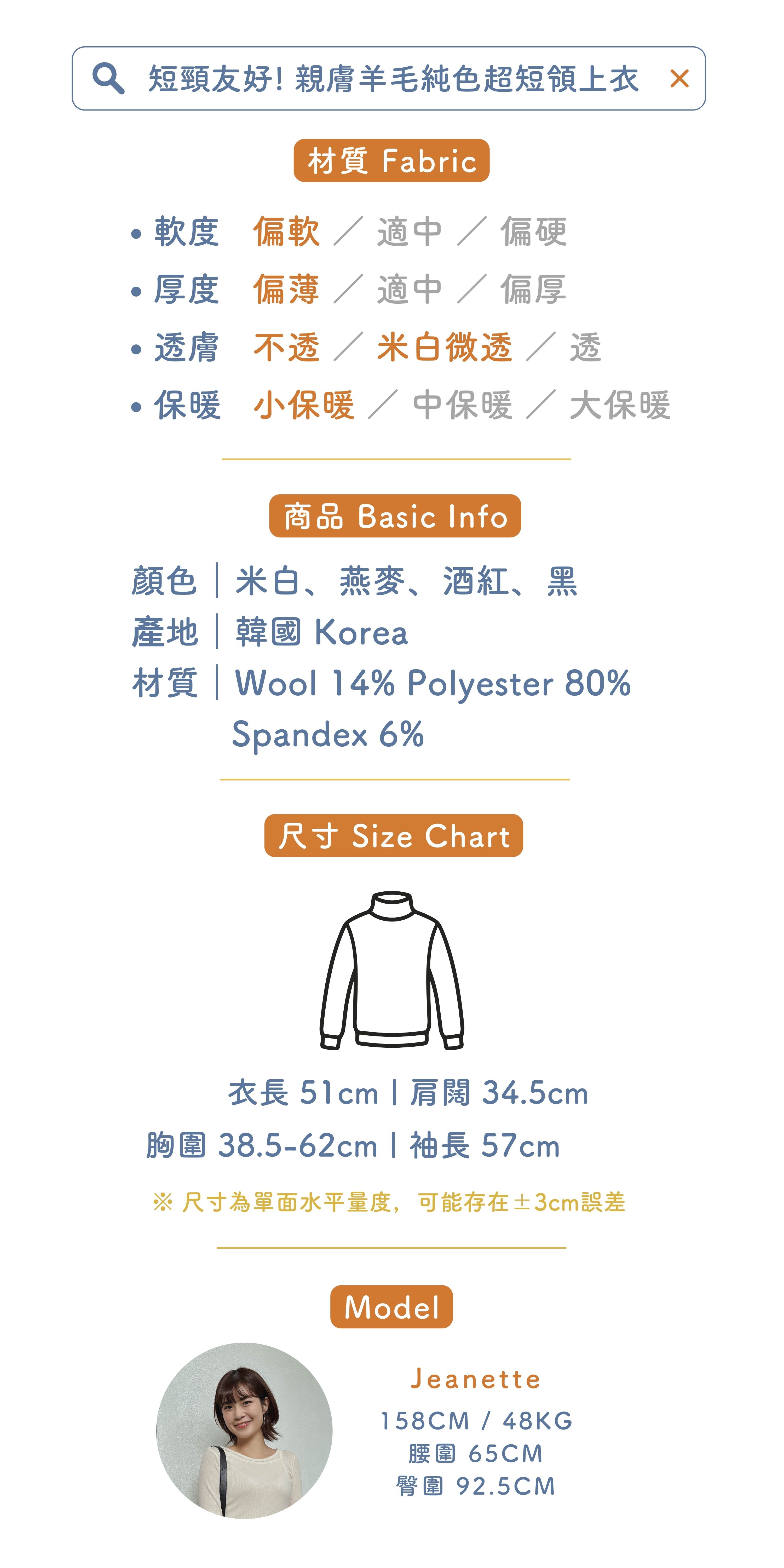 短頸友好! 親膚羊毛純色超短領上衣 (四色入)